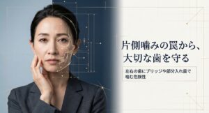 【この記事のまとめ】 左下のブリッジをかばうために右側ばかりで噛む「片側噛み」を続けた結果、右下奥歯に過剰な負荷が集中し、歯がグラグラになって抜歯に至るケースが50代以降から急増します。 失った右下にもブリッジを入れると […]