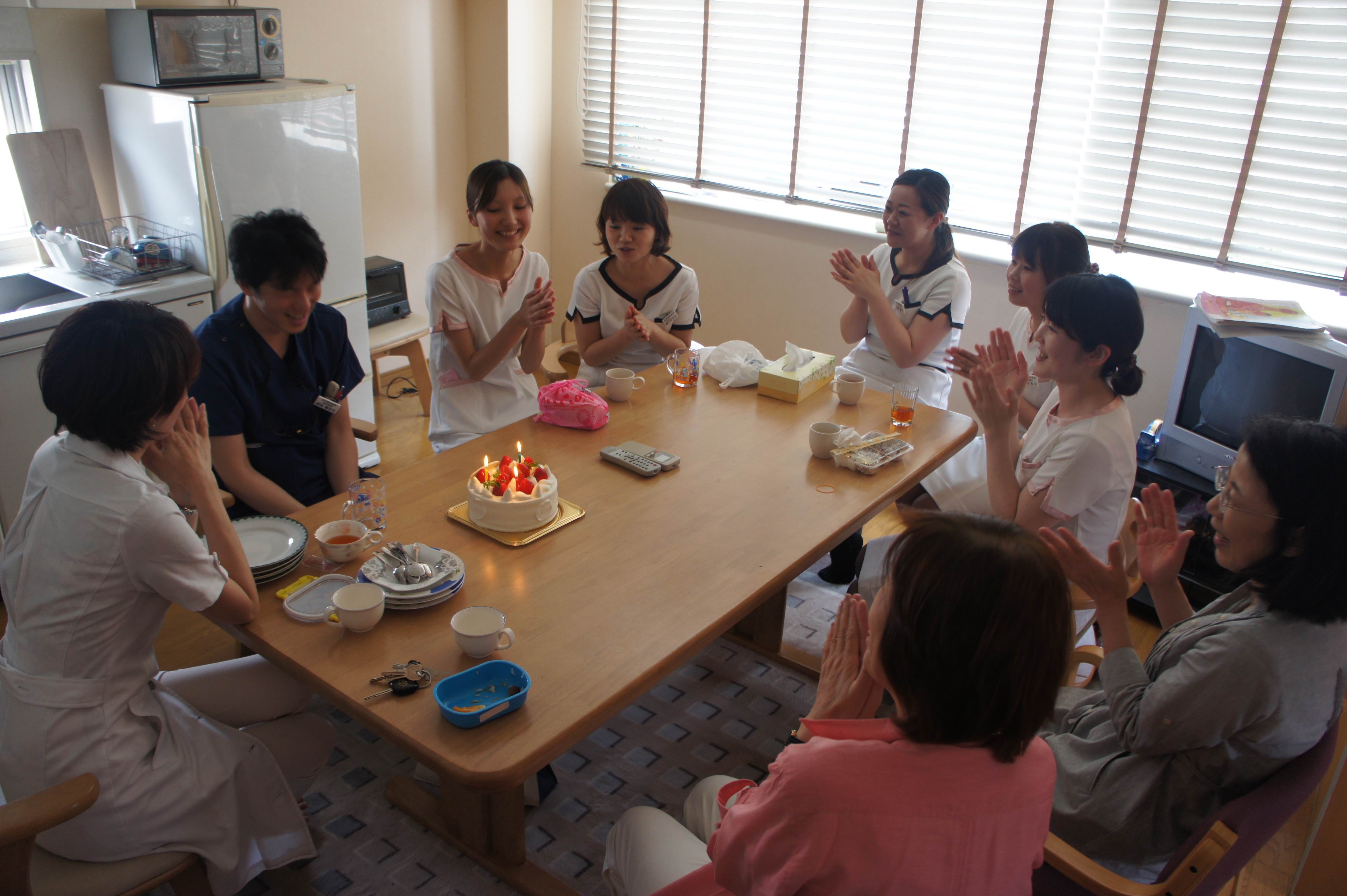 女性スタッフの中に一人新枝先生♂が混じってご飯を食べています。