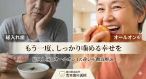 長年、歯周病の再発を繰り返していると、「一生懸命歯磨きをしているのに、なぜ治らないんだろう…」と不安や諦めを感じてしまうこともあるかもしれません。しかし、もしその原因がケア不足ではなく、ご自身の「噛み合わせ」のバランスが崩れていることにあったとしたら?根本的な原因が違えば、アプローチ方法も変わってきます。吉本歯科医院では、歯と噛み合わせのスペシャリストである「日本歯科専門医機構認定 補綴歯科専門医」が、あなたの歯周病の本当の原因を多角的に診断します。「もう治らない」と諦める前に、一度専門家の視点でご自身のお口の状態を確認してみませんか?お一人で悩まず、まずはお気軽にご相談ください。美味しく食事ができ、思い切り笑える毎日を取り戻すための一歩を、一緒に踏み出しましょう。