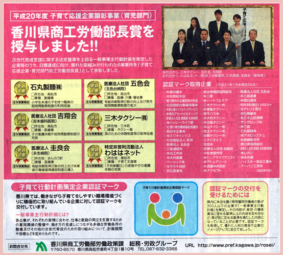 仕事と子育てを両立しやすい職場環境づくりに積極的な企業を香川県が表彰するものだ。