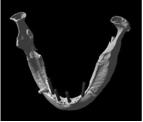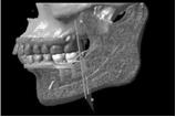 通常の人の骨です。矢印先の丸く見えているのが下顎の中にある下歯槽神経の出口(オトガイ孔)です