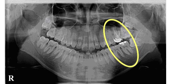 親知らずによって、手前の歯の神経がちょんとブチ切られていますよね。
