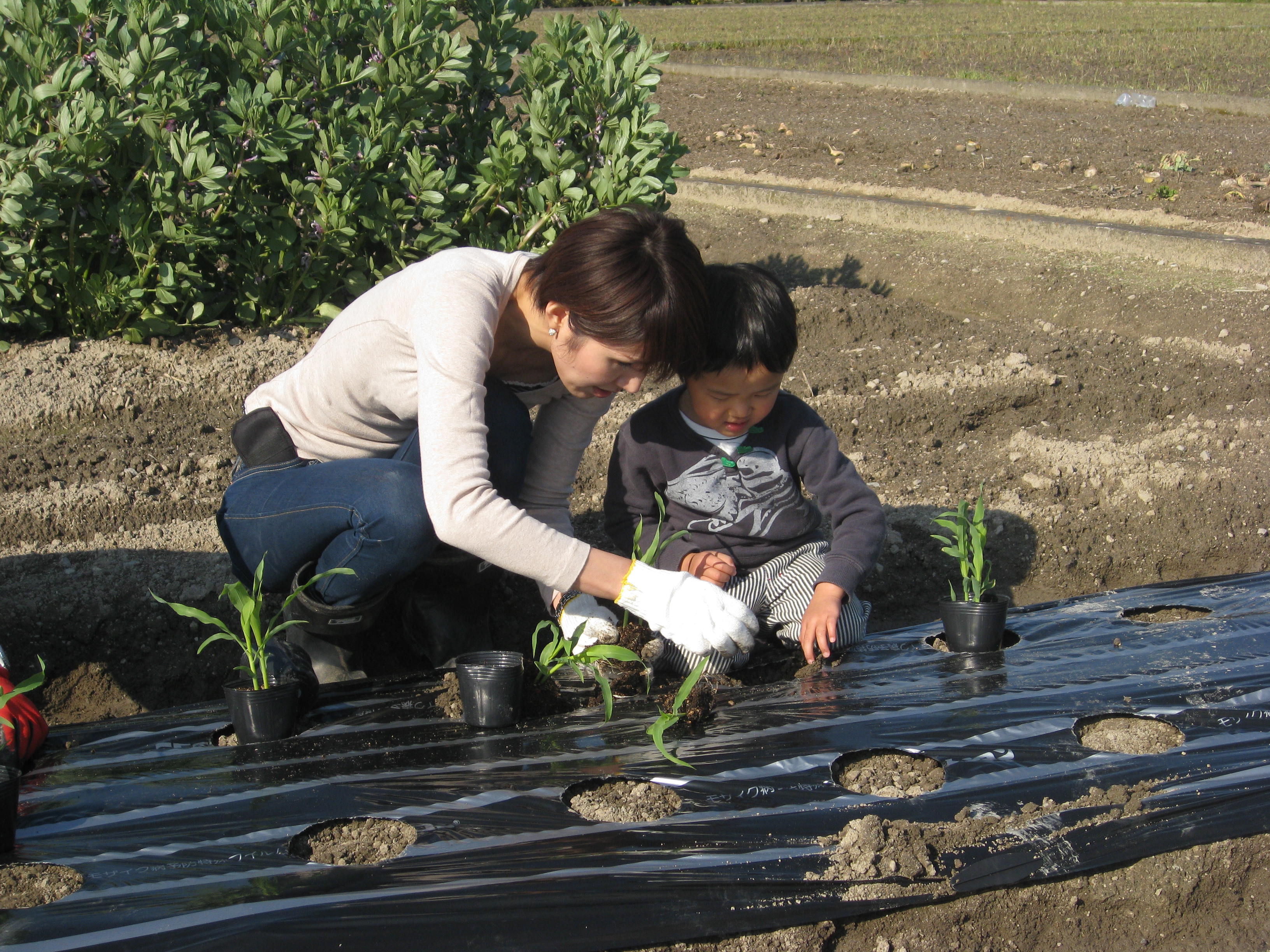 穴をあけたところに苗を置いていきます。何の苗??