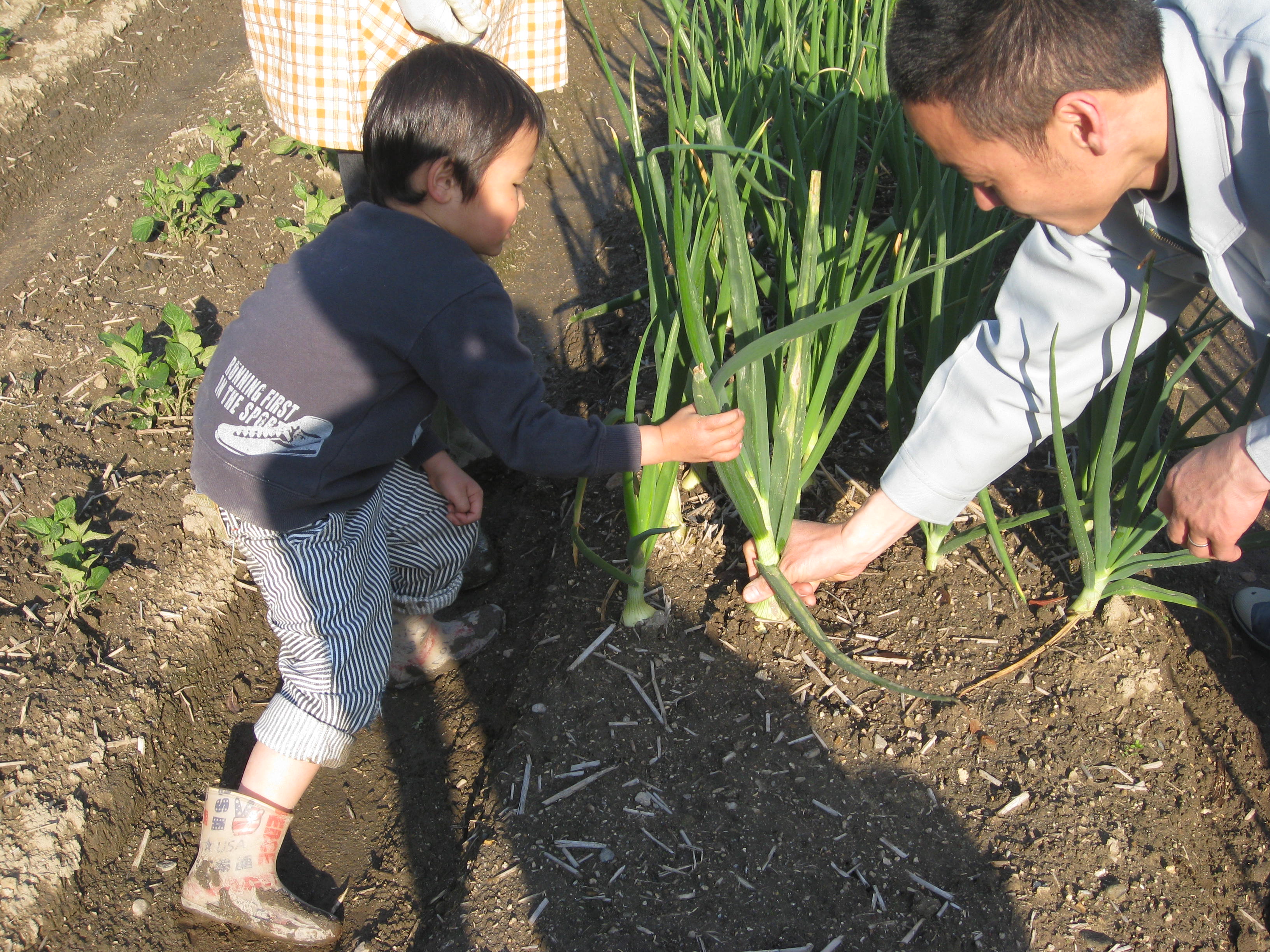 たまねぎを引っこ抜いています。うんとこしょどっこいしょ、です。