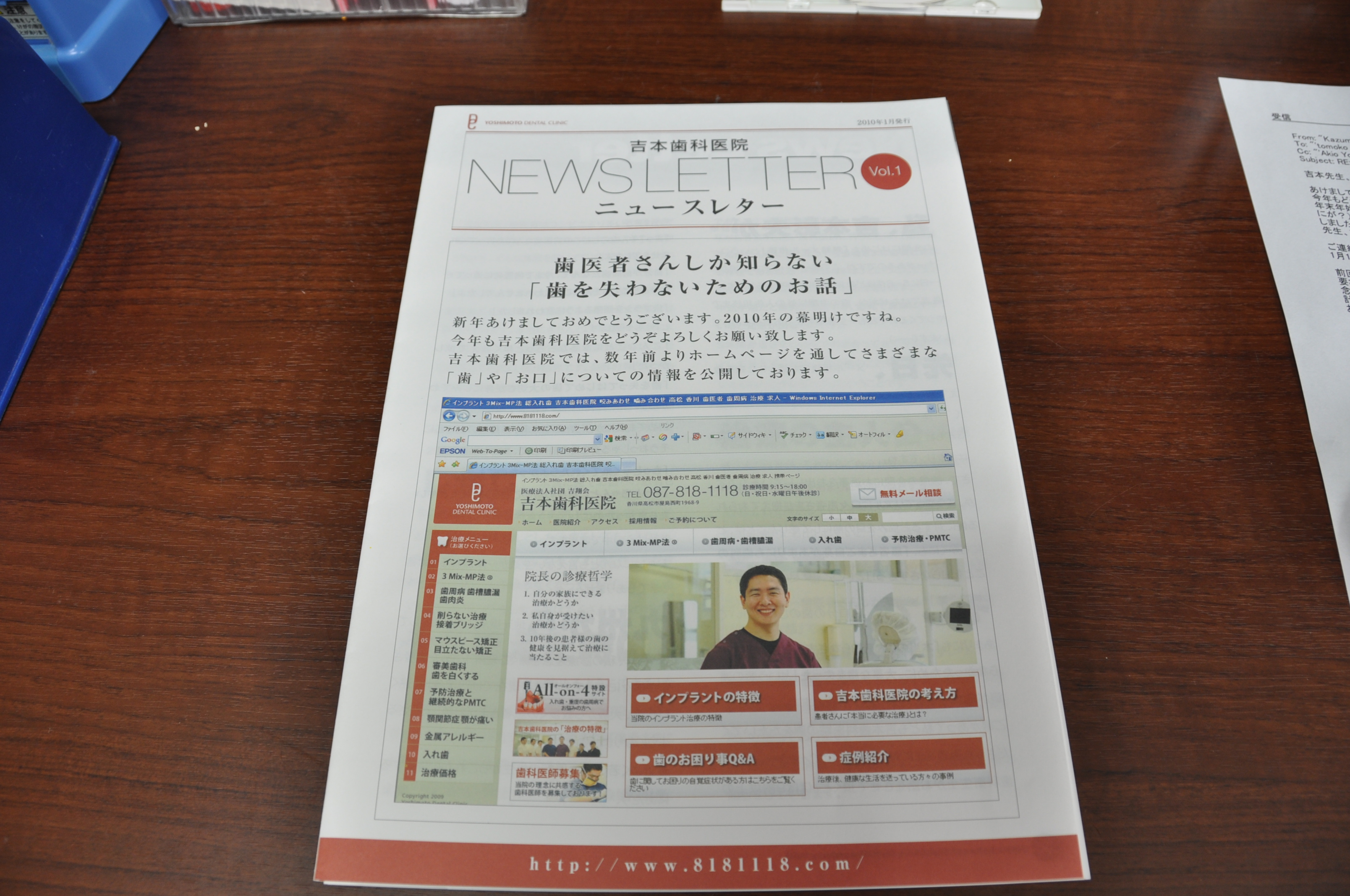さて、昨年よりシコシコと作成しておりました吉本歯科医院のニュースレターが出来上がりました(^^)本日よりお越しいただいた患者さまにお渡しさせて頂いております。