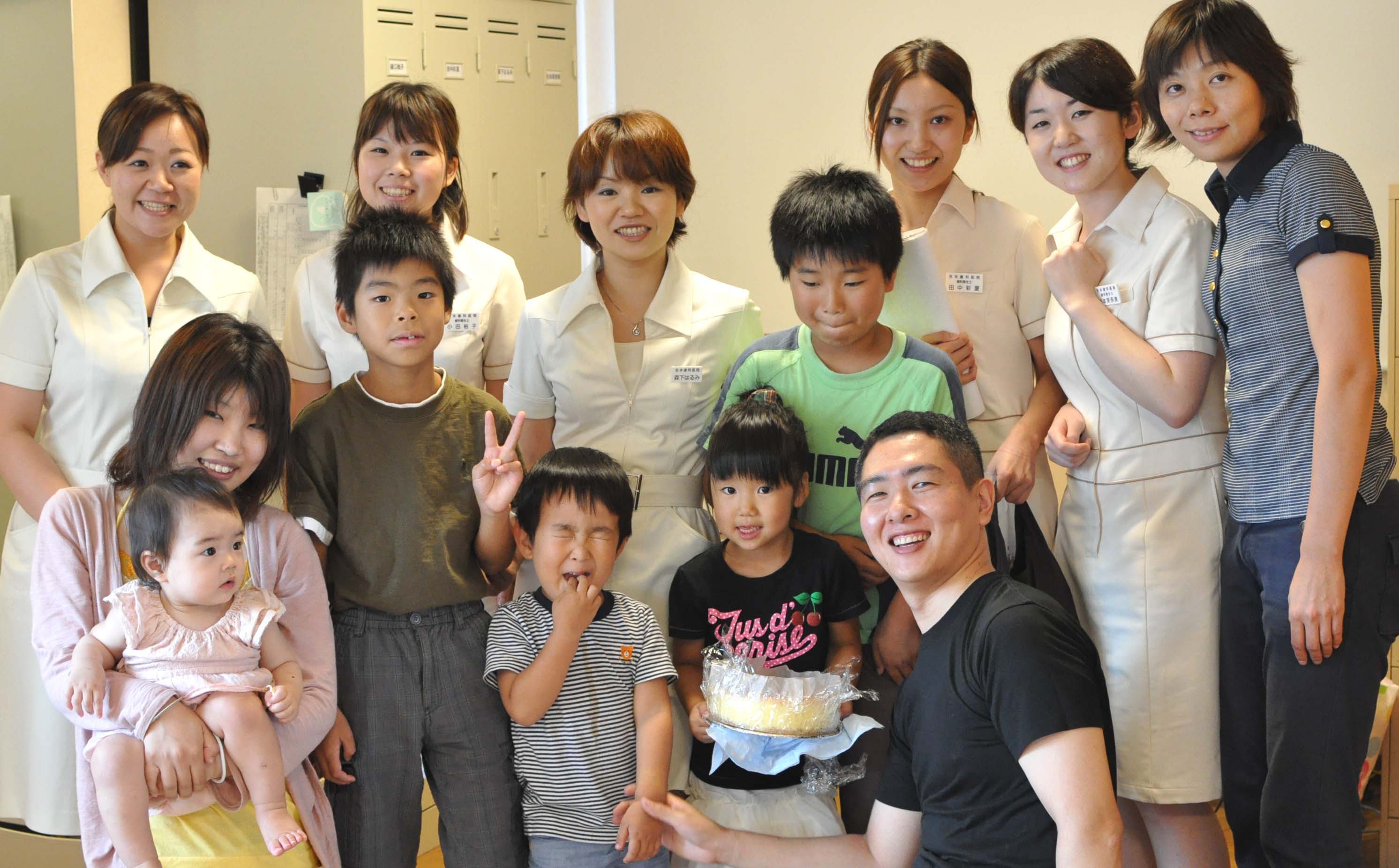 吉本歯科医院の名カウンセラー森下を囲んで。みんなの良きお姉さんの存在の彼女は吉本歯科医院と患者さま、吉本歯科医院と歯科技工所さんなど、あらゆる関りのパイプ役となってくれています。吉本歯科医院では、森下を通して頂くと話が非常にスムーズに進みます。