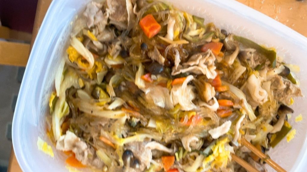 白菜、人参、しいたけ、しめじ、ピーマン、パプリカ、たまねぎ、豚バラ肉、春雨