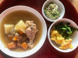 今日の吉本歯科医院のお昼ご飯は肉じゃが、マカロニサラダ、鳴門わかめたっぷりお味噌汁、雑穀入りご飯。