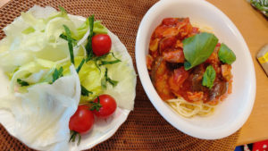 吉本歯科医院の今日のお昼ご飯【定番☆なすとベーコンのトマトパスタ】