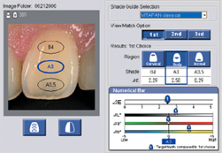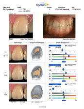 撮影した画像は専用ソフト「クリスタルアイ アプリケーションマスター」でサービカル(歯頚部)、ボディ(中央部)、インサイザル(切縁部)別にベストマッチするシェード、そしてシェードガイドとの色差(⊿E)、明度(⊿L*)、赤味(⊿a*)、黄色味(⊿b*)を数値とわかりやすいグラフ表示で瞬時に表示します。