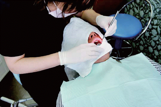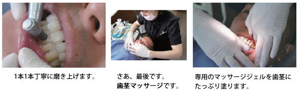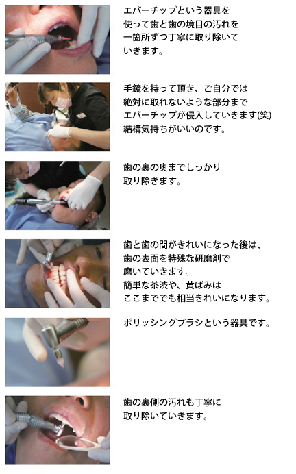 専門のトレーニングを受けた歯科医師・歯科衛生士が、歯の表面についた歯垢(細菌の塊)や沈着物を特殊な医療器機を使って完全に取り去った後、歯垢(細菌の塊)の再付着を防ぎ歯の質を強くするためにフッ素を塗布する流れで治療を行います。