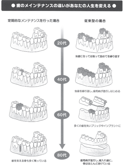 下記は、歯のメインテナンスを行なった方とそうでない方の違いを表わした図です。