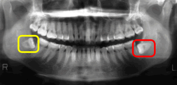 親知らずによって、手前の歯の神経がちょんとブチ切られていますよね。